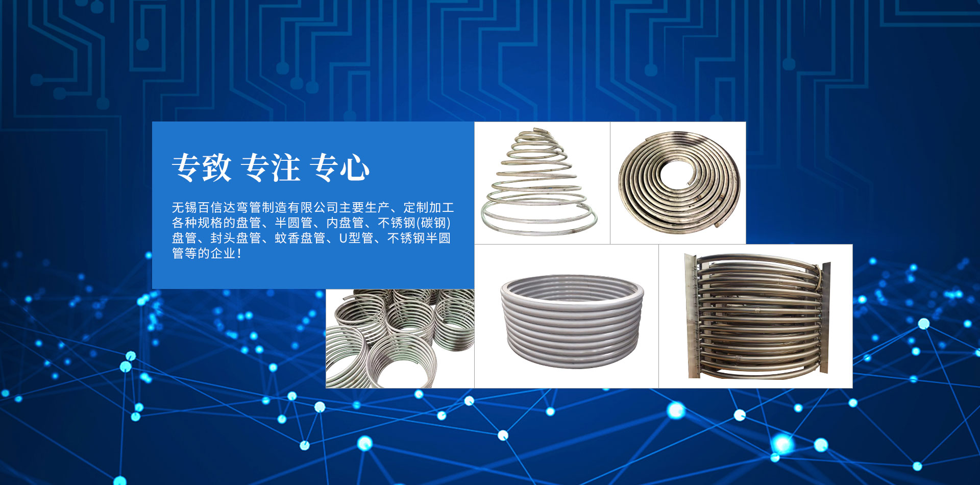 無錫百信達彎管制造有限公司位于經濟發(fā)達、風景秀麗的太湖之濱。本公司擁有完整、科學的質量管理體系,公司的誠信、實力和產品質量獲得業界的認可。公司專注生產、定制加工各種規(guī)格的盤管、半圓管、內盤管、不銹鋼盤管、封頭盤管、蚊香盤管、U型管、不銹鋼半圓管、碳鋼盤管等的企業。本公司設計加工的彎管設備,質量精良、結構合理,效率高、操作簡易、經久耐用。公司已經承接了各地多個大型場館工程項目的彎管加工,屢次得到了多家大客戶的好評。努力滿足客戶的需要,不斷提高自身水平是公司追求的目標。歡迎社會各界朋友蒞臨無錫百信達彎管制造有限公司參觀、指導和業務洽談!